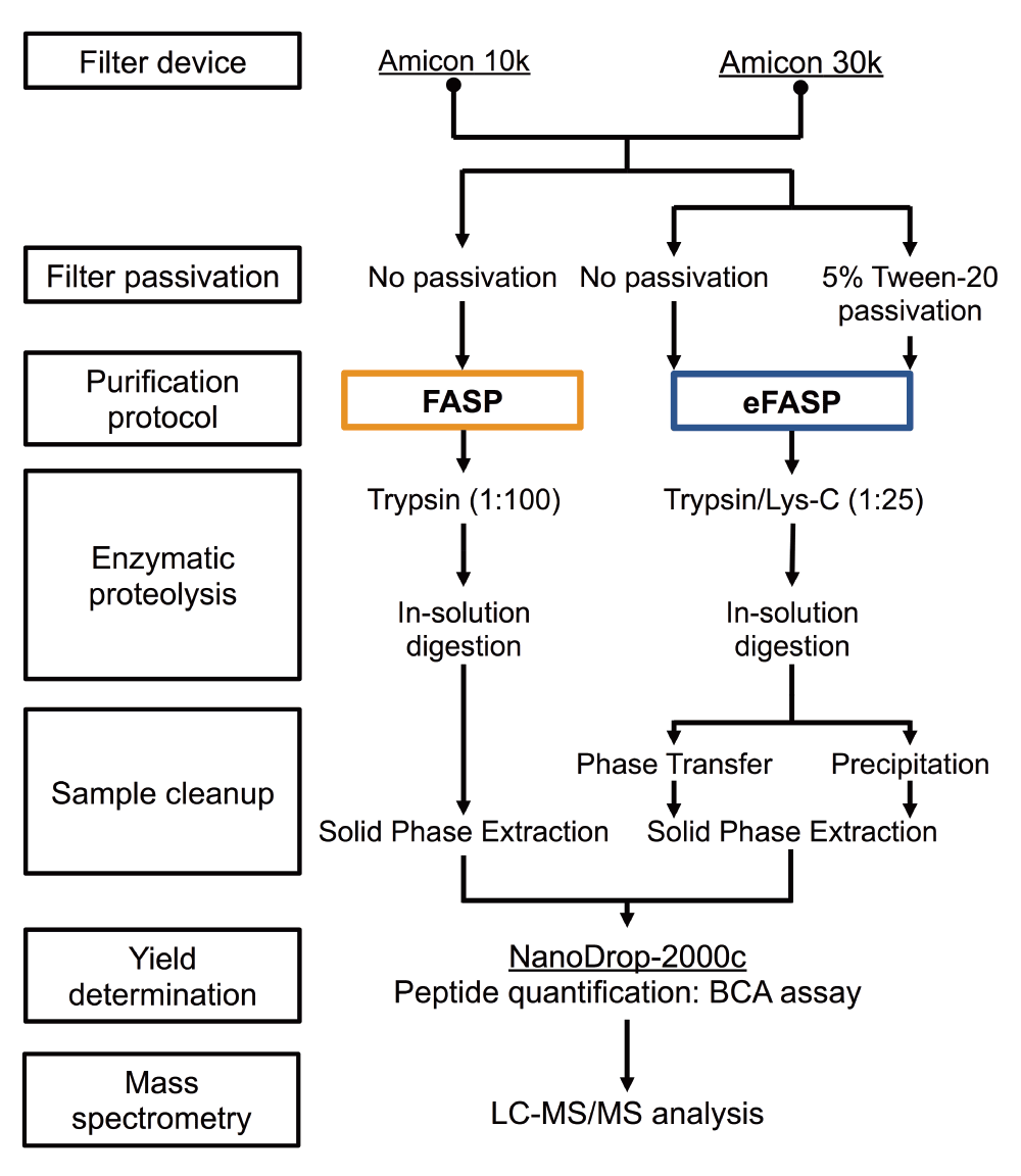 Herein, we report a reproducible Amicon-adapted enhanced FASP (eFASP) workflow for comprehensive proteomics that is based on the best practices in sample preparation of SDS-containing protein extracts. The Amicon-adapted eFASP method presents key modifications to the FASP protocol and addresses the above-raised concerns. We compared both methods for SDS removal efficacy, depth of proteome coverage and reproducibility. Our results show that Amicon-adapted eFASP compares favourably to FASP and can therefore be regarded as a new alternative sample preparation approach for proteomics.