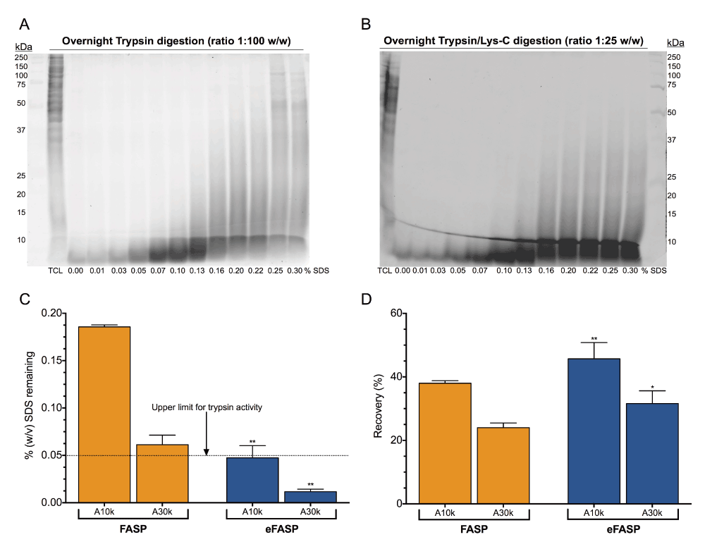 - Supplementary Figure 1. Effect of increasing concentrations of SDS on FASP (trypsin) and Amicon-adapted eFASP (trypsin/Lys-C) overnight digestion efficacy