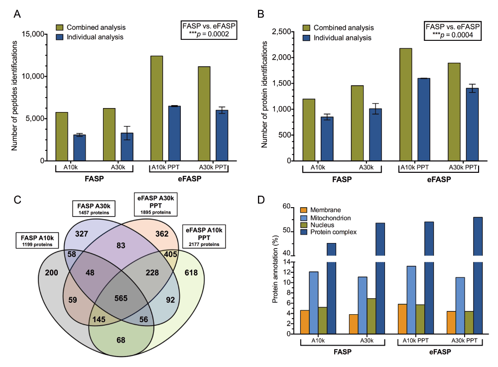In summary, our Amicon-adapted eFASP protocol is an optimized Amicon unit-based sample preparation approach that provides efficient removal of SDS, high reproducibility, deep proteome coverage and enhanced identification of membrane proteins. Amicon-adapted eFASP enabled the identification of 1,700 proteins from SDS-solubilized proteins with minimal sample preparation and no fractionation, within a single run one-hr liquid chromatography and using a 15-cm column. Its implementation in proteomics may therefore improve the identification of high-confidence and significant biomarkers.