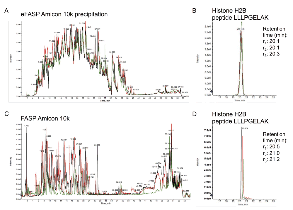Total ion current (TIC) chromatograms of the three replicates from (A) Amicon-adapted eFASP Amicon 10k precipitation (maximal signal intensity: 4.0e7) and (C) FASP Amicon 10k (maximal signal intensity: 1.5e7) within the total 1-hr analytical liquid chromatography gradient. Extracted-ion chromatograms of Histone H2B peptide LLLPGELAK from (B) Amicon-adapted eFASP Amicon 10k precipitation (maximum signal intensity: 2.5e6) and (D) FASP Amicon 10k (maximum signal intensity: 7.5e5). (B, D) The retention time (minutes) of the peptide is also indicated for each replicate.