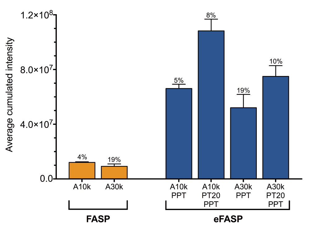 Bars show the average cumulated MS signals intensities from each replicate for the five most intense peptides from the five most abundant identified proteins per protocol. Error bars are representative of the standard deviation of the mean associated with each replicate analysis. Data were summarized from triplicate experiments and duplicate experiments for the Amicon-adapted eFASP passivated Amicon 10k and Amicon 30k precipitation (Amicon-adapted eFASP/A10k/PT20/PPT and Amicon-adapted eFASP/A30k/PT20/PPT) protocols. Numbers above error bars indicate the coefficient of variation in the average cumulated MS signal intensities. PPT: Precipitation. PT20: 5% Tween-20 passivation.