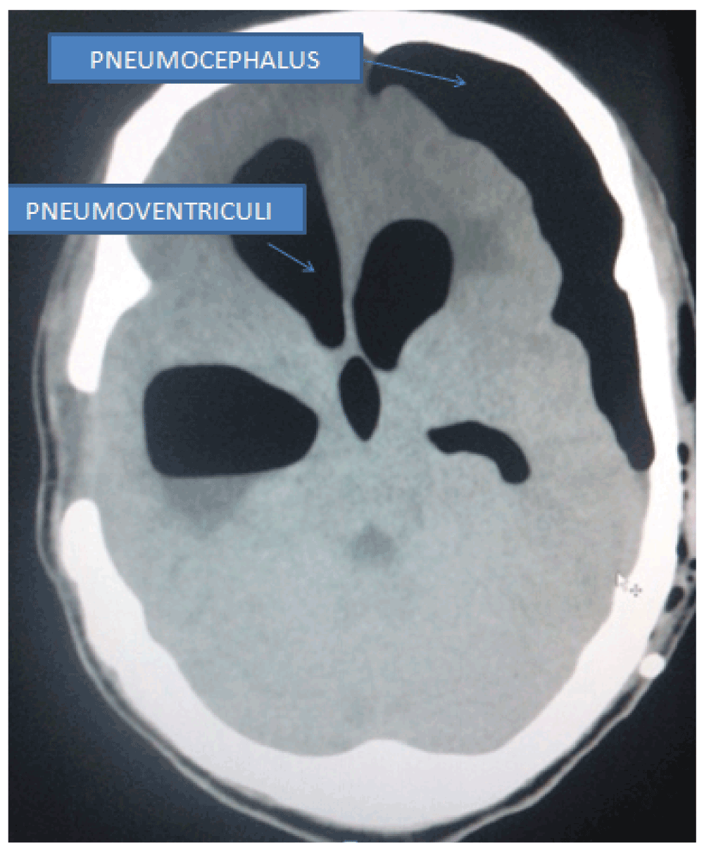 There is also risk of seizure and rapid neurological deterioration due to tension pneumocephalus. Once this occurs, close monitoring of the patient, rapid and accurate identification of tension pneumocephalus, and immediate surgical intervention is life-saving. Gore et al.8 have advocated the use of 100% oxygen for rapid resolution of pneumocephalus.