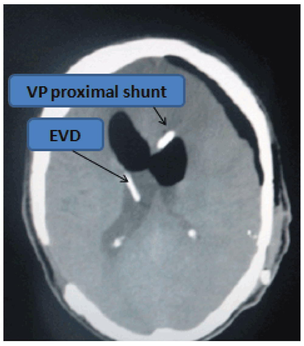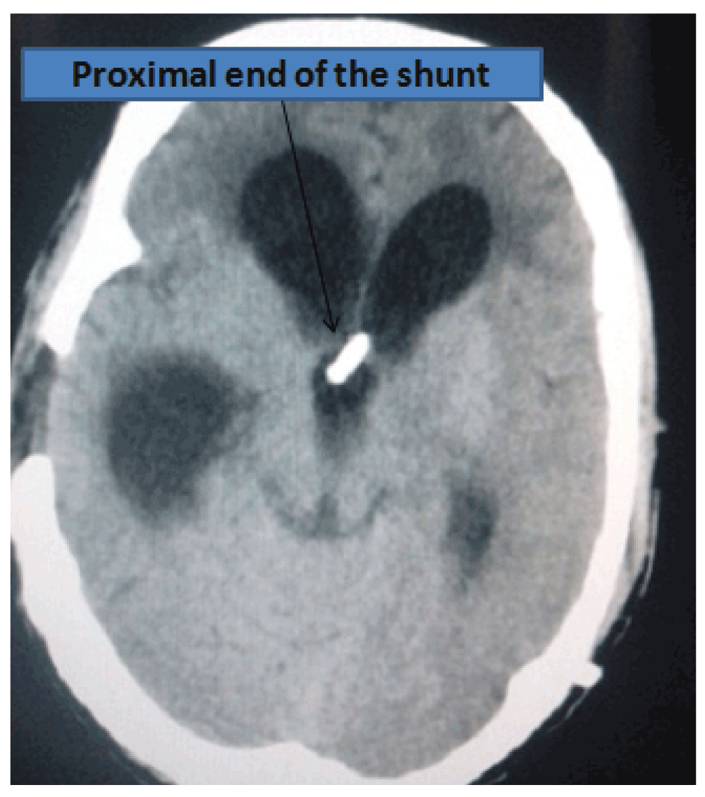 Herein we report a case of a 35-year-old male from Nawalparasi, Nepal, who had undergone a craniotomy and evacuation of acute subdural hematoma following an automobile accident 2 months before admission to our institution. He presented with complaints of an abnormal gait, with a tendency to fall backwards and also with features of frontal lobe-related incontinence. There were no significant past medical illnesses. He was taking Sodium Valproate (300 mg oral three times daily) as seizure prophylaxis following the traumatic head injury and surgical intervention for the same 2 months previously. Fundus examination revealed the presence of papilledema. A head computerized tomography (CT) scan revealed the presence of evolving hydrocephalus. To rule out hydrocephalus ex vacuo due to volume loss and changes in CSF dynamics subsequent to the previous accident, external ventricular drainage (EVD) was placed which revealed egress of CSF under pressure. Thereafter he was scheduled for insertion of a VP shunt. During insertion of the VP shunt, there was dry tap during an attempt of ventriculostomy from the Kocher’s point. We made two further attempts to ensure the correct trajectory of the shunt end and also to reflush the shunt end to prevent blockage due to blood clots and cell debris. We placed the shunt tip in the presumed location of the foramen of Monro of the frontal horn of ipsilateral lateral ventricle. We did not remove the EVD, hoping that it would act as a safety channel for CSF bypass had we missed the correct trajectory for the VP shunt.