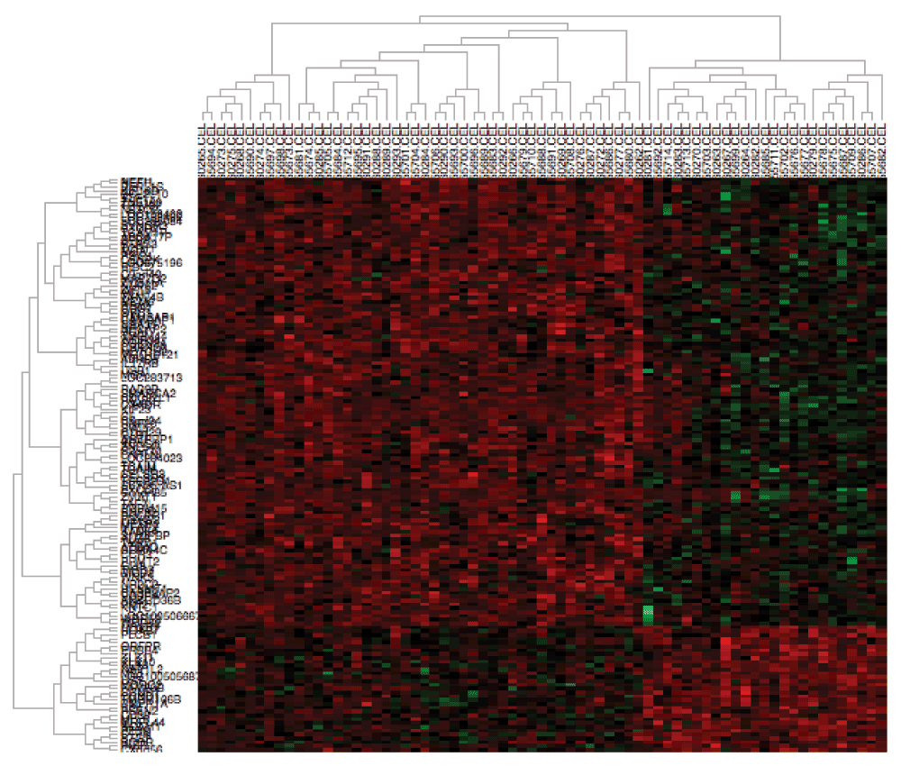 As an example, we perform analysis on sample datasets containing gene expression of primary head and neck squamous cell carcinoma (HNSCC) tumors. We downloaded measurements from a combination of frozen tumor samples from two distinct studies in GEO available under accession numbers GSE103002 and GSE679111, representing two distinct batches. Raw CEL files and annotation csv files were obtained as described in the User’s manual. We initialize AGA by selecting the directory containing these data. Once loaded, we check the HPV and Tumor.Source.Type columns to group the samples into primary HPV-positive and HPV-negative tumors for differential expression analysis. We then click “Run the Analysis” to normalize the CEL files with fRMA5, batch correct the data with ComBat and SVA, and perform differential expression analysis. The plot in the Dendrogram Plot tab confirms that the batch effects are apparent between these datasets but removed after batch. The heatmap generated in the Heatmap Plot tab (Figure 1) demonstrates that the batch correction nonetheless preserves gene expression difference between HPV-positive and HPV-negative tumors. Moreover, performing differential expression analysis comparing HPV-positive and HPV-negative HNSCC in the “Differential Analysis” tab confirms the well-established overexpression (p=8.74e-9) of CDKN2A (p16) in HPV-positive HNSCC13,14.