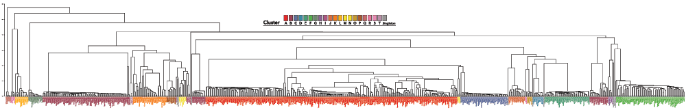 Hierarchical clustering dendrogram constructed on pairwise Euclidean distances between all 663 phages in the mycobacteriophage database. In almost every case, phages are placed in a monophyletic clade with members of their subcluster, highlighting the concordance between alignment-based and alignment-free methods for comparison for these genomes. Some clusters (F, C, D, M and L) form monophyletic clades, while others (B, for example) are grouped in different parts of the dendrogram. A larger version of this figure can be downloaded from here.