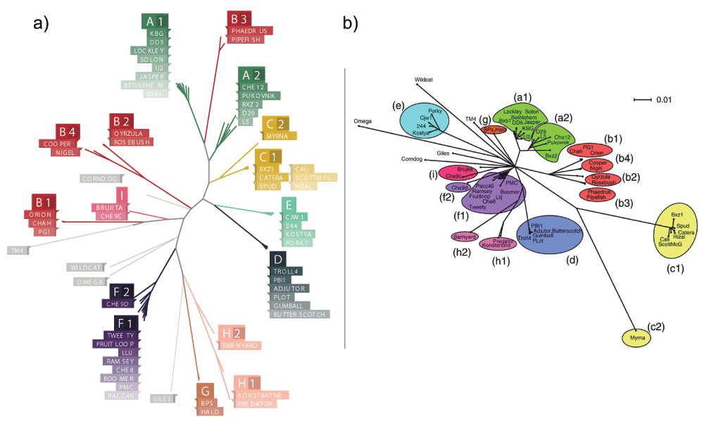 We would like to thank Sarah Taylor for instructing the Brown University Phage Hunters course and for her assistance during the development and presentation of this work. The present manuscript benefited from helpful comments by Dr. Graham Hatfull. We would also like to thank the hundreds of students from schools participating in the SEA-PHAGES program who have isolated, characterized and purified the mycobacteriophages we analyzed. Finally, we are deeply grateful to the SEA-PHAGES program and Howard Hughes Medical Institute for providing the resources to sequence hundreds of mycobacteriophage genomes, and PhagesDB.org for providing access to the unpublished material that formed the base of this work.