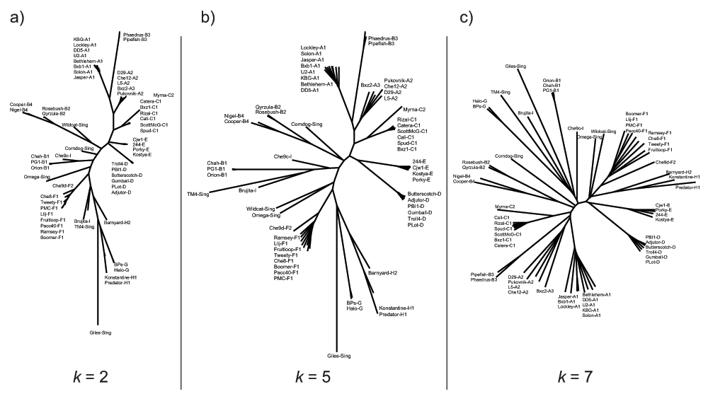 Neighbor joining phylogenetic trees constructed from pairwise Euclidean distances between oligonucleotide usage deviation vectors for 60 mycobacteriophage genomes. Trees from k equal to two, five and seven are shown here. Trees show a high degree of similarity regardless of the k used. Trends observed in the tetranucleotide usage based tree (Figure 1), such as grouping of subcluster members into monophyletic clades, are conserved in these trees.
