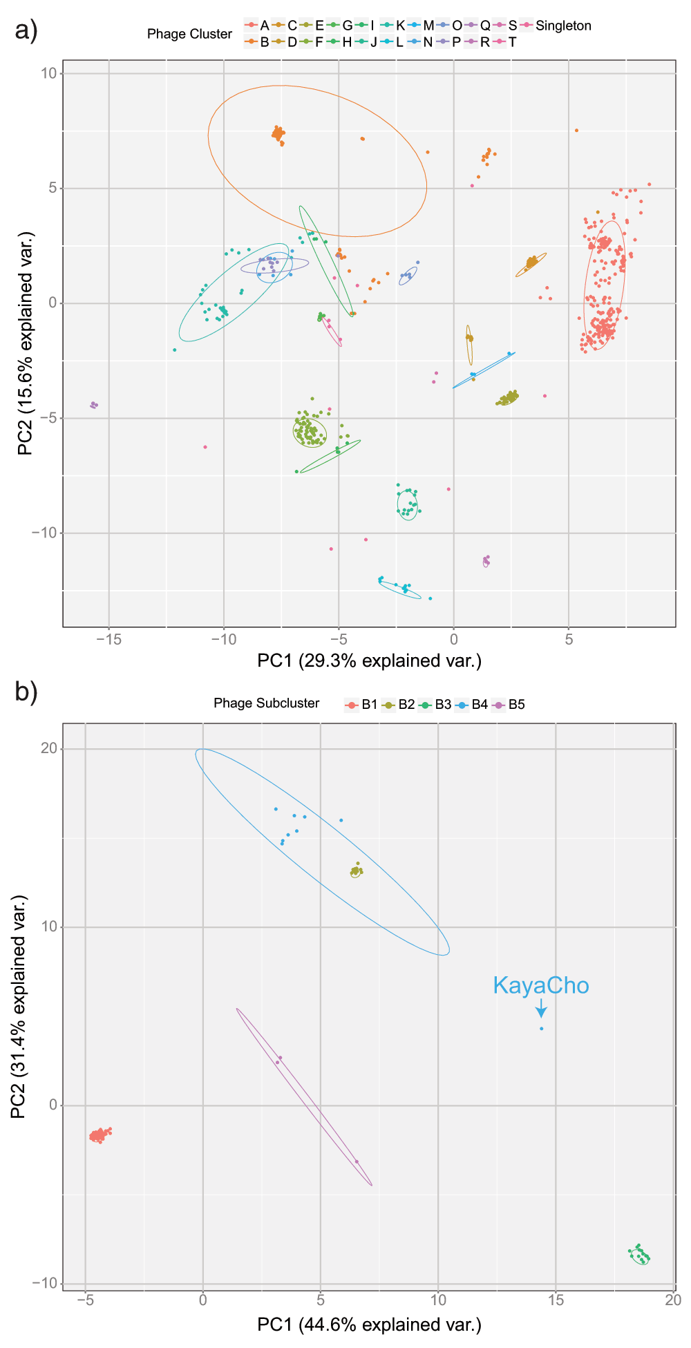 a) Principal components analysis of all 663 mycobacteriophage genomes. Individual clusters of phages are well separated by PC1 and PC2 in most cases. Further separation can be achieved by incorporating additional principal components. b) Principal components analysis of cluster B phages. Individual subclusters are well separated. The outlier in B4 is KayaCho, a phage with different tetranucleotide usage but similar genome architecture when compared with other B4 phages.