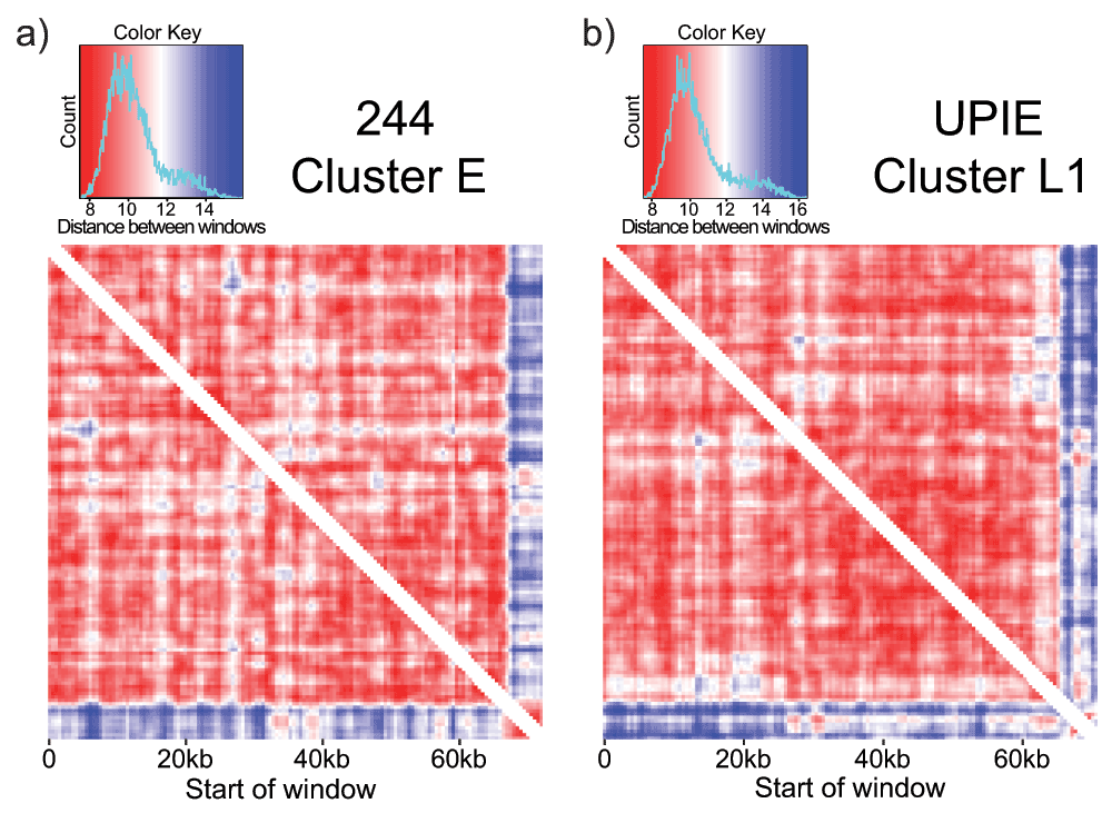 Comparing tetranucleotide usage in a sliding window (2000bp window, 500bp step size) across phage genomes. Each entry in the heatmap is the Euclidean distance between windows. a) 244, a cluster E phage, is relatively self-similar with low distance values (red) between most windows. The last 5kb of the genome is an exception: it is self-similar but different than the rest of the genome. This signature is not driven by repetitive sequences, and represents a putative HGT event. b) UPIE, a cluster L1 phage, also has a self-similar signature at the end of the genome. However, the difference in TUD in this window is driven by two cluster of repetitive k-mers (Figure 5).