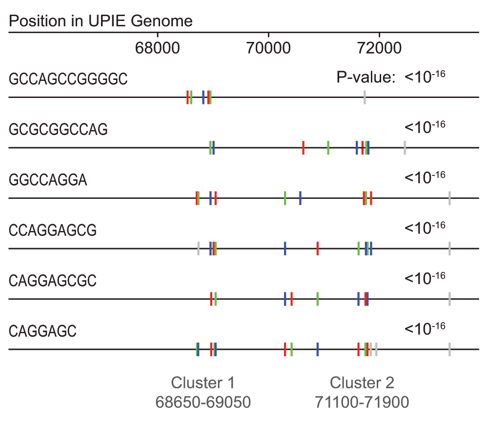Two clusters of GC-rich repetitive sequences at the end of the genome of UPIE (cluster L1). The repetitive sequences drive the differences in TUD and correspond with the self-similar yet genome-different sections in the within-genome heatmap (Figure 4). This image was reconstructed from the output of Repfind (Betley et al., 2002).
