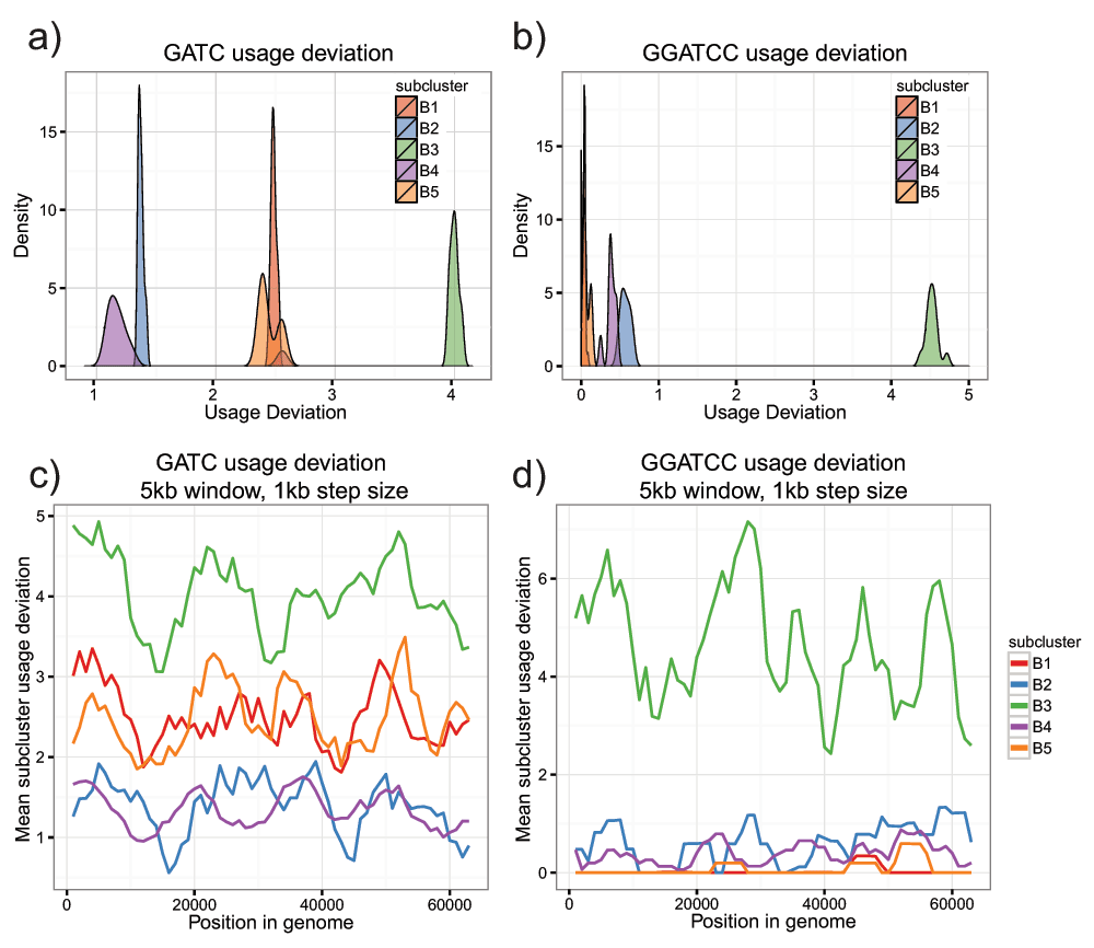a) Density plot of TUD values for the 4-mer GATC. Individual subclusters form well-defined groups. B3 phages have GATC usage four times what is expected, much higher than other B subclusters. b) Repeat of (a) with the 6-mer GGATCC. B3 phages use this 6-mer greater than four times what is expected. c) GATC usage deviation in a sliding window (5kb, 1kb step size). Each line represents the mean value in the specified subcluster. The increase in GATC usage is genome-wide, indicative of a global change in usage frequency. d) Repeat of (c) with the 6-mer GGATCC. Increased usage is also genome-wide.