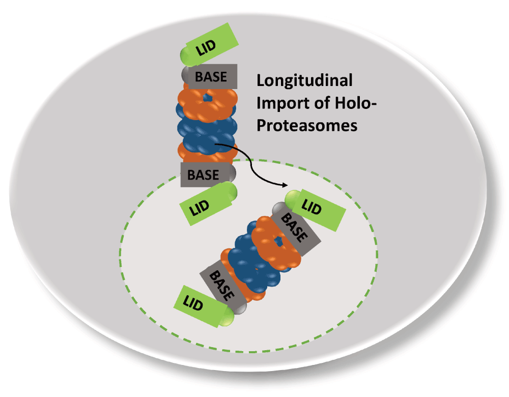 For the RP, the import pathway upon exit from quiescence is yet to be solidified. A possible candidate for a RP-dedicated nuclear import receptor is Rpn2 which exhibits a similar α-solenoid fold as Blm10 and importin β, all of which belong to the family of HEAT-repeat proteins (Huber & Groll, 2012; Kajava, 2002).