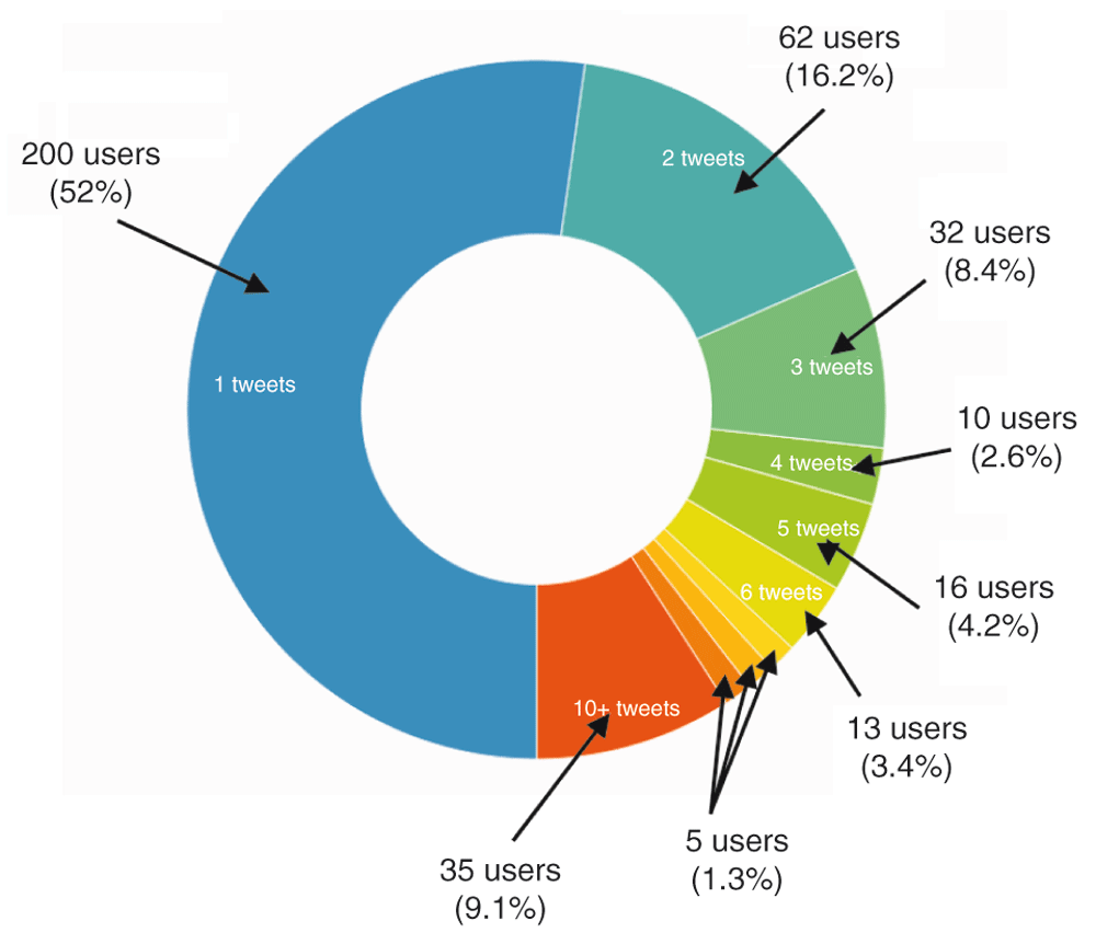 Given the nature of a Twitter discussion, it is perhaps more useful to present data relating to the number of contributions that users made as a whole, rather than as an average. Figure 3 depicts the individual contributions by author, and it is apparent that over half of the tweeters made only one contribution to the competition (200 users). More encouragingly, over 20% of contributors tweeted five or more times, and almost 10% of the contributors tweeted more than ten times. Indeed, the latter statistic infers that at least some useful exchanges were being made, even if it is difficult to gauge from such data how successful the exchanges may have been. The overall reach of each individual is difficult to estimate from such a dataset. One contributor may have contributed ten tweets to the discussion that has 300 people contributing, for example, yet only have ten followers, giving an overall reach value of around 310 people. Conversely, one person may have 1000 followers yet only contribute one tweet, yet their reach would be around 1300 people for one tweet alone. Therefore, it is fair to assume that Twitter can have a larger impact if the user has more followers, regardless of the number of contributions. This is one area that will be useful for further investigation, insofar as number of exchanges within one single conversation, number of tweets in that exchange, the relation of the interactions to the work presented (or indeed if it was just friendly chat), and the possibility of other collaborators engaging in dialogue over social media. This is currently beyond the scope of this work, but will be the subject of future investigations.
