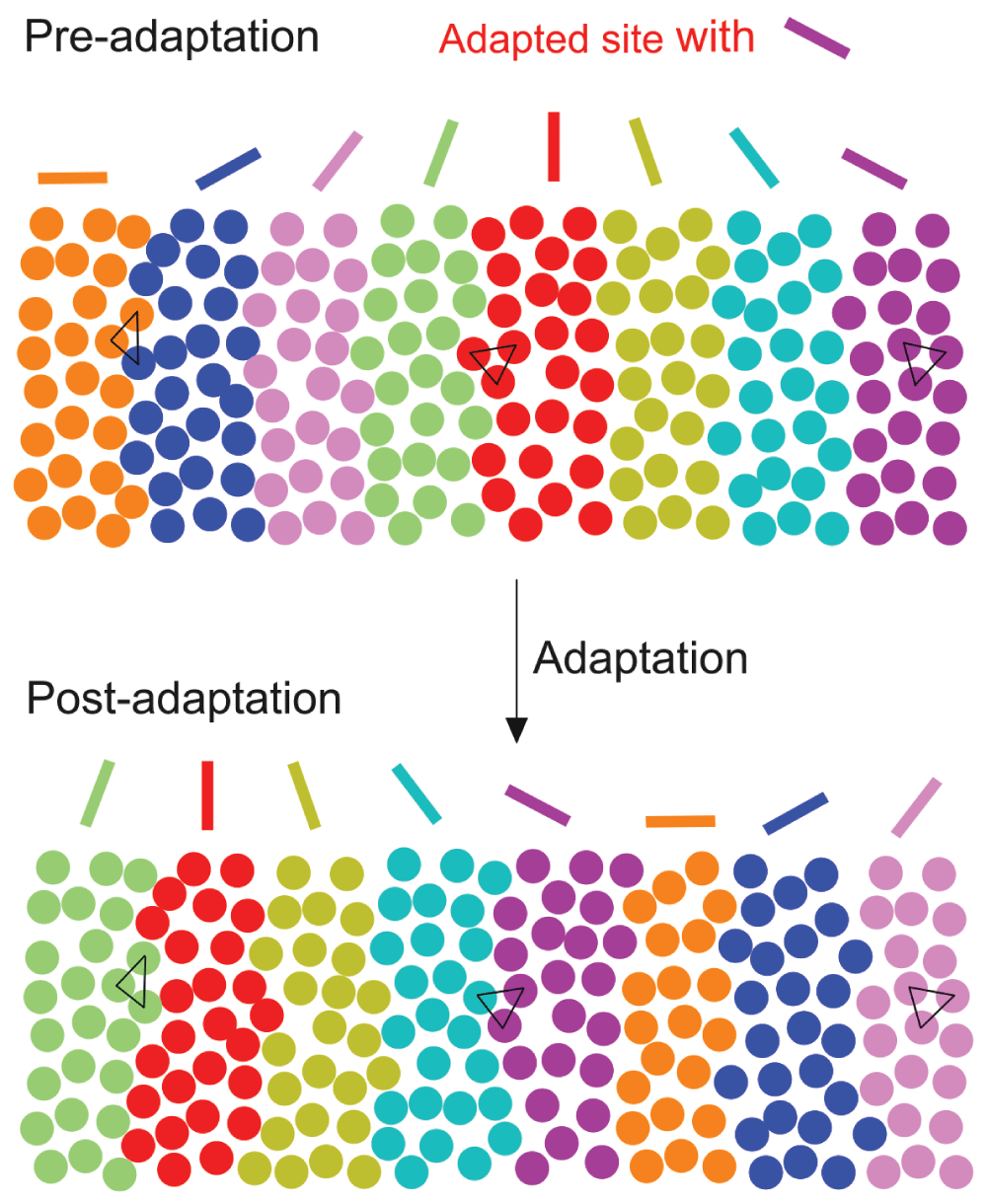 Here we put forth a concept through our recent results on the functional reprogramming of orientation columns in the visual cortex (Bachatene et al., 2015b). In that report, we showed that neurons at the adapted and non-adapted cortical sites exhibited similar pattern of shifts. It is particularly interesting that the non-adapted neurons (not challenged by the adapter) also displayed changes in their orientation selectivity (they exhibited both types shifts). This is illustrated as an example in Figure 1. The upper row displays a hypothetical layout of orientation columns in control conditions. The activities of nine neurons under observation were recorded simultaneously that were tuned distinctly at each location (neurons at each location are linked by a black triangle; all three sites had non-overlapping receptive fields). After the adaptation procedure, neurons at each site changed their selectivity irrespective of the fact that only neurons tuned to 90° (pre-adaptation, red-columned neurons, middle triangle) were challenged with an adapter (157.5° degree orientation, purple bar). Notably, post-adaptation, two neurons (middle triangle, purple neurons) at the adapted site exhibited an attractive shift whereas one neuron displayed repulsion. In other words, only two neurons learnt the adapter whereas the third neuron swayed away from this behaviour. Interestingly, non-adapted neurons in other columns (left and right triangles) also displayed orientation selectivity shifts following adaptation.