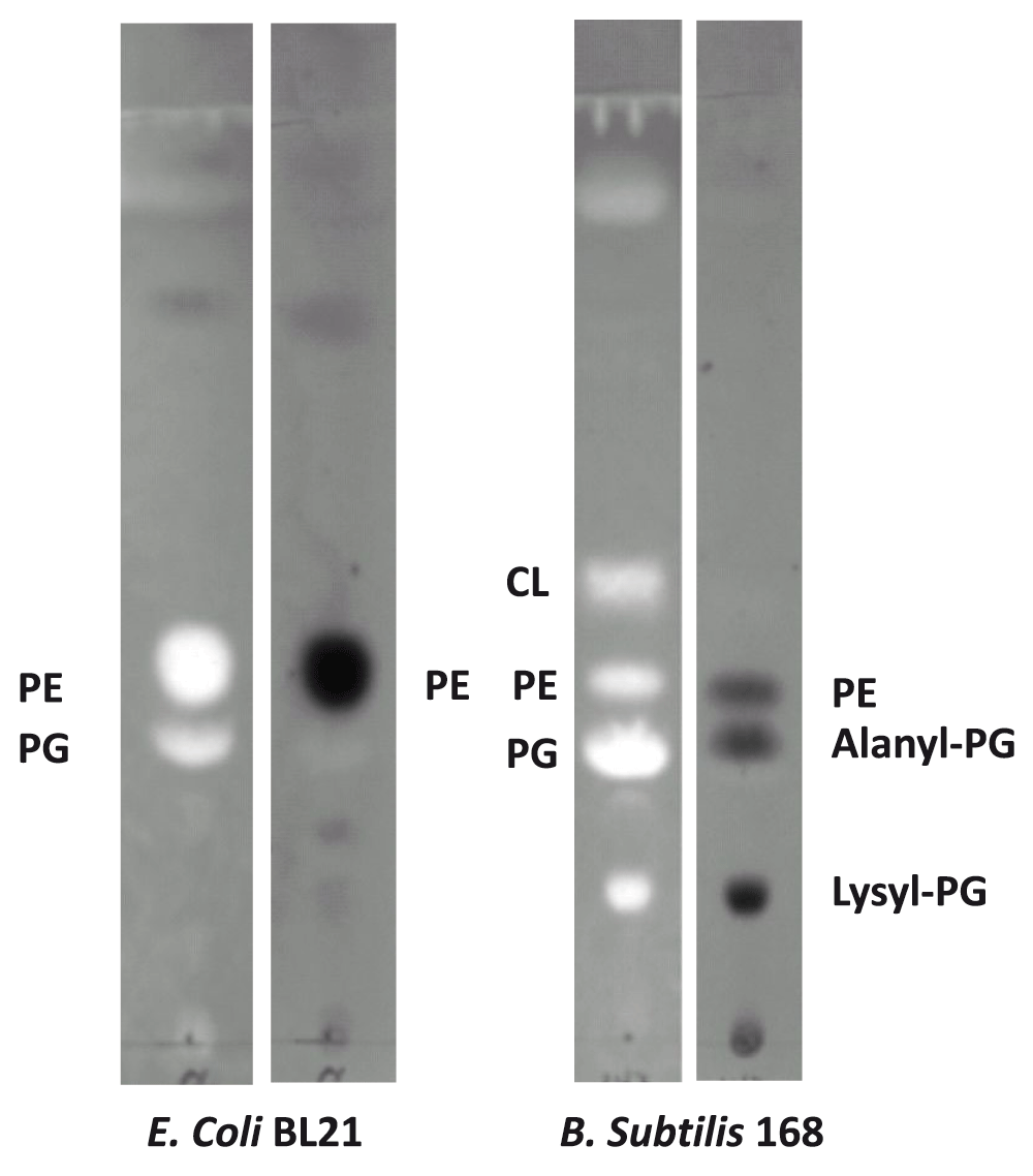 In most bacteria, phospholipids are the dominant cell membrane component1. The phosphate moieties in these lipid molecules dictate the overall negative nature of bacterial membranes. This electrostatic feature makes them susceptible to cationic antibiotic peptides such as defensins2–4. In response to environmental challenges, bacteria constantly change their membrane composition1,5. Incorporation of less saturated and shorter fatty acyl chains makes the membrane more fluidic1. Gram-negative bacteria generally have a high concentration of zwitterionic phosphatidylethanolamine (PE) which masks this anionic surface feature1,6. In comparison, Gram-positive bacteria in general have much less PE1. However, they are abundant in aminoacylated phosphatidylglycerol (aminoacyl-PG), especially L-lysyl-PG5,7. The pivotal protein for aminoacyl-PG biosynthesis from L-aminoacyl-tRNA and PG is the lysyl-PG synthase MprF (multiple peptide resistance factor)8 which appears to have a broad range of specificity for L-aminoacyl-tRNAs9,10. The crystal structures of the cytoplasmic catalytic domains of two MprFs, with one specific for lysyl- the other for alanyl-PG biosynthesis, have recently been elucidated11. The catalytic domains of the two MprF enzymes have a long tunnel for accommodating PG with the catalytic site located at the narrowest part of the tunnel11. The primary and tertiary structures of MprF resemble that of FemX which catalyzes L-alanyl transfer from tRNA to a peptidoglycan precursor12. Both proteins are potential targets for novel antibiotics. MprF of Bacillus subtilis over-expressed in Escherichia coli has been observed to synthesize both L-lysyl-PG and L-alanyl-PG in the presence of aminoacyl-t-RNA10. We expect to find both lysyl- and alanyl-PGs in B. subtilis lipids.