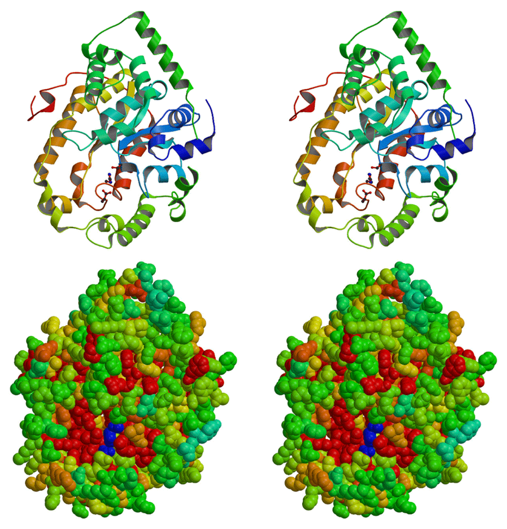 A, Ribbons diagram of DltD. The side chains in the Ser-His-Asp triad are shown in ball-and-stick model. B, Space-filling model of DltD. The most conserved residues are shown in red, and the least conserved in green. The putative catalytic triad is shown in blue.