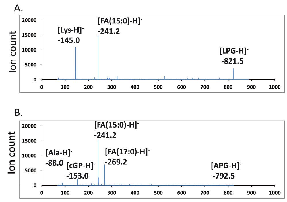 Major peaks in the MS/MS spectra are labeled. FA – fatty acid, LPG – (30:0) lysyl-PG, APG – (32:0) alanyl-PG, cGP – cyclo-glycerol-phosphate. A. MS/MS spectrum of lysyl-PG. B. MS/MS spectrum of alanyl-PG.
