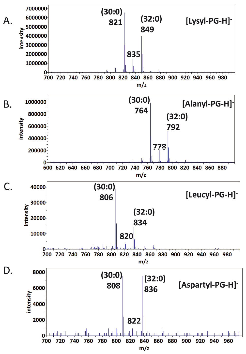 Precursor scans for aminoacyl-PGs – Besides lysyl- and alanyl-PGs, there were no molecular ions in the MS spectra which matched expected m/z values for other types of aminoacyl-PG ions. The abundance of the deprotonated aminoacyl ions prompted us to utilize this structural feature to search with high sensitivity for lipid precursors which produce such fragment ions. We first tested this protocol on lysyl- and alanyl-PGs and similarly esterized CL. The dominant molecular anions from the precursor scans at a collision energy of -65 electronvolts matched the expected m/z values of lysyl-PG and alanyl-PG species with two (15:0) or (17:0) fatty acyl chains (Figure 3A & 3B). The two types of lipid species with less abundant fatty-acyl compositions were also identified as peaks separated by 14 amu that corresponds to a methylene group. No aminoacyl-CL was identified in higher mass range around 1500 amu. We then applied such precursor scans to search for other aminoacylated PGs or CLs. With the exception of cysteine, the scans identified correct sized candidates of molecular anions of 17 aminoacyl-PGs with two clearest examples of leucyl-PG and aspartyl-PG shown in Figure 3C & 3D. The scans were not able to differentiate between glutamine and lysine, or between leucine and isoleucine, which share similar or identical molecular mass.