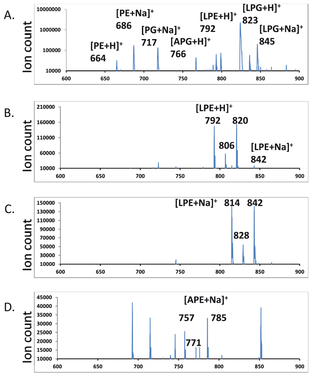 Irreproducibility of aminoacyl-PEs – Although the presence of aminoacyl-PEs was interesting at first, we no longer found their presence when several new batches of the bacterial polar lipids were extracted without the final drying step at 30°C. It appears that the drying process may have caused existing species PE and aminoacyl-PGs in the lipids to chemically react to produce aminoacyl-PEs. This should be a caution which needs attention while sensitive profiling by mass spectrometry is employed.