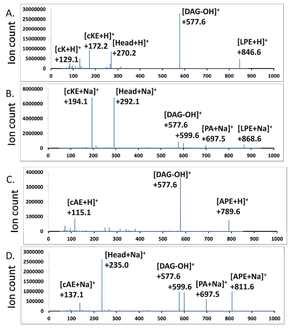 Protonated and sodiated ions are shown. LPE – (16:0–18:1) lysyl-PE, APE – (16:0–18:1) alanyl-PE, PA – phosphatidyl acid, DAG – diacylglycerol, Head – head group, cAE – cyclo-alanyl-ethanolamine, cK – cyclo-lysine, cKE – cyclo-lysyl-ethanolamine. A & B. Lysyl-PE. C & D. Alanyl-PE.