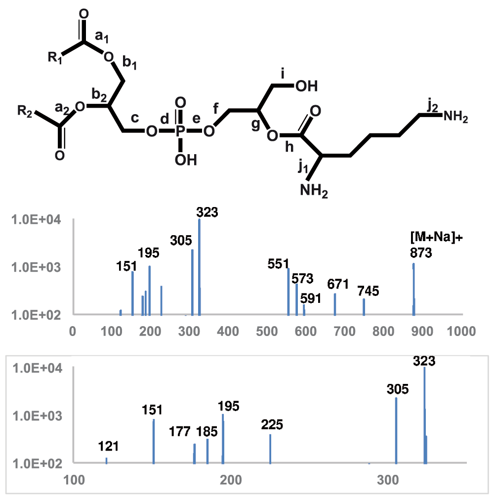 MS/MS spectrum of sodiated lysyl-PG (873 amu) ions is shown. The molecular structure is shown on the top with scissile bonds labeled alphabetically. The horizontal axis represents m/z values. The vertical axis represents ion counts.