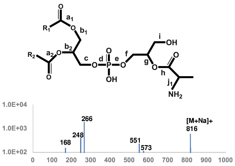 MS/MS spectrum of sodiated alanyl-PG (816 amu) ions is shown. The molecular structure is shown on the top with scissile bonds labeled alphabetically. The horizontal axis represents m/z values. The vertical axis represents ion counts.