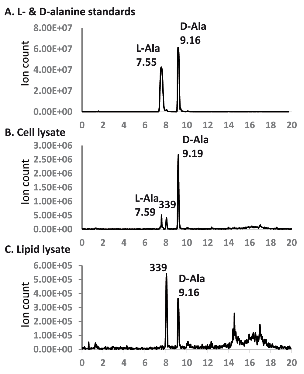 LC/MS analysis of D- and L-alanine in lipid and whole cell lysates – Alanyl groups in the bacterial lipids as well as on bacterial cell surface are known to be labile under mild alkaline conditions35,36. We established a set of alkaline hydrolysis and alanine extraction protocols that were practically complete at both hydrolysis and extraction stages. Since ammonia and formic acid residues were removed by evaporation, these reagents did not pose any interference with later experimental steps of TLC, conjugation with Marfey’s reagent, and mass spectrometry. By Marfey’s design, the derivatives of D-amino acids tend to have longer retention times on a reverse-phase column than their respective L-amino acid derivatives. The D-alanyl-derivative of Marfey’s reagent eluted significantly later and as a higher and sharper peak at 9.16 minutes than that of the L-alanyl-derivative which eluted at 7.55 minutes (Figure 8). The alanine released by alkaline hydrolysis of bacterial cells was predominantly D-alanine (~90%), while that of lipids was exclusively D-alanine. By comparing the ion counts with the standard D- and L-alanine solution (equivalent to 1 mM each), the 0.1 ml lysate from 1.5 ml of bacterial cells contained ~0.05 mM D-alanine, while the 0.1 ml lipid lysate contained ~0.05 mM D-alanine. Considering that the lipid lysate was derived from ~100-fold more bacterial cells than the whole cell sample, there appeared to be 1000-fold more D-alanine on the cell surface than that in the membrane. We typically obtained 5–10 mg dried lipids from 0.9 g wet cell pellet, which corresponds to a weight ratio of approximately 100. By taking into account this weight ratio, we estimate that whole cell still has ~10-fold denser D-alanine than membrane. Importantly, the alanylated phosphatidylglycerol is D-alanyl-PG, it is therefore not synthesized from tRNA-carried L-alanyl by a reaction catalyzed by MprF. Instead, another well-known source of activated alanine carried by D-alanine carrier protein DltC in the form of thioester22,37 may be the most likely origin.