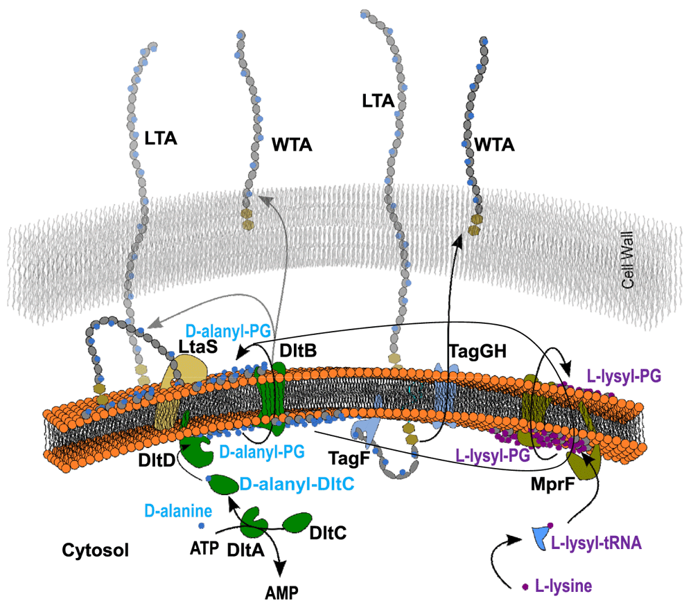 Gram-positive, Antibiotic resistance, Membrane, Charge, Phospholipid, Teichoic acid, alanyl-phosphatidylglycerol, lysyl-phosphatidylglycerol, aminoacylated phospholipids, D-alanylation