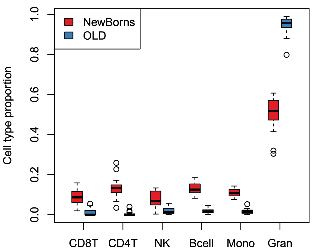 ## [estimateCellCounts] Estimating composition.# plot cell type proportions by age par(mfrow=c(1,1)) a = cellCounts[age.targets$Sample_Group == "NewBorns",] b = cellCounts[age.targets$Sample_Group == "OLD",] boxplot(a, at=0:5*3 + 1, xlim=c(0, 18), ylim=range(a, b), xaxt="n", col=age.pal[1], main="", ylab="Cell type proportion") boxplot(b, at=0:5*3 + 2, xaxt="n", add=TRUE, col=age.pal[2]) axis(1, at=0:5*3 + 1.5, labels=colnames(a), tick=TRUE) legend("topleft", legend=c("NewBorns","OLD"), fill=age.pal)