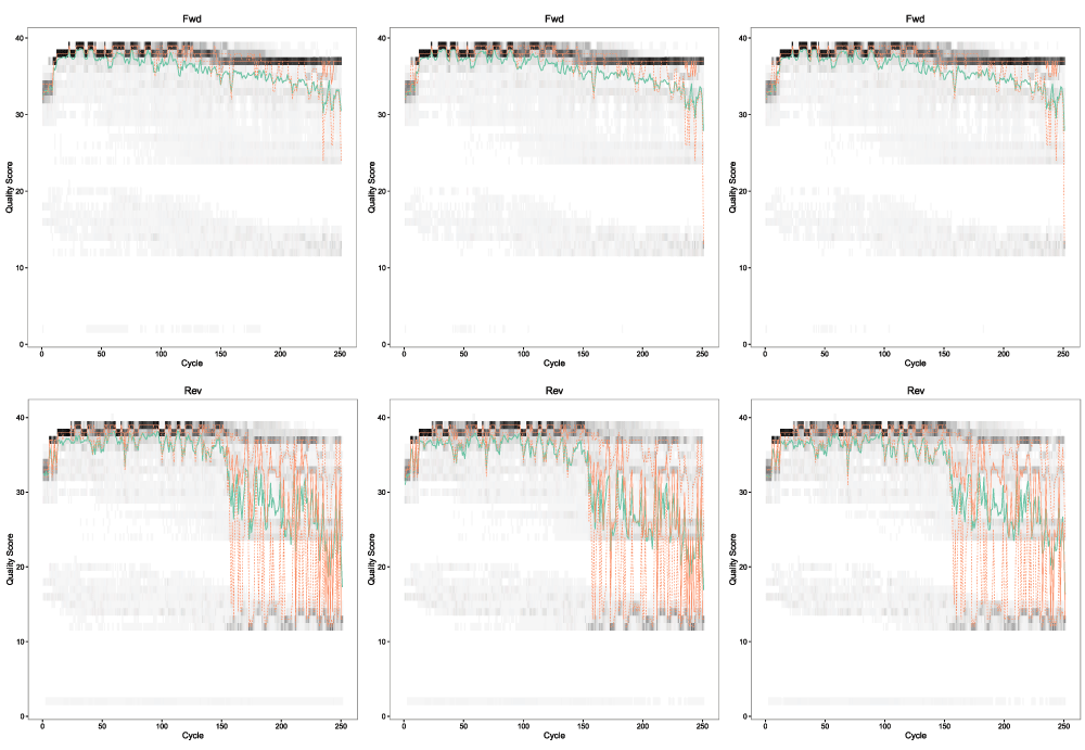 ii <- sample(length(fnFs), 3) for(i in ii) { print(plotQualityProfile(fnFs[i]) + ggtitle("Fwd")) } for(i in ii) { print(plotQualityProfile(fnRs[i]) + ggtitle("Rev")) }