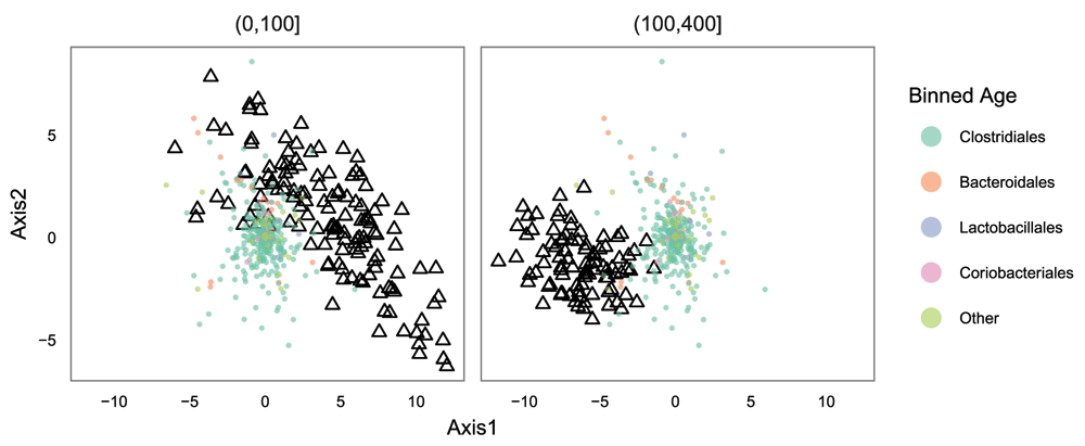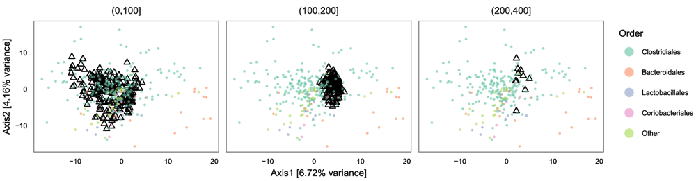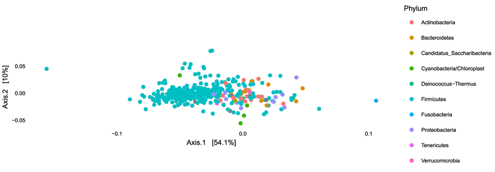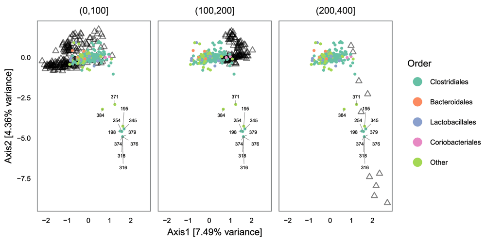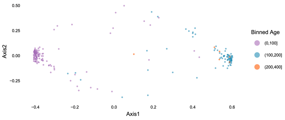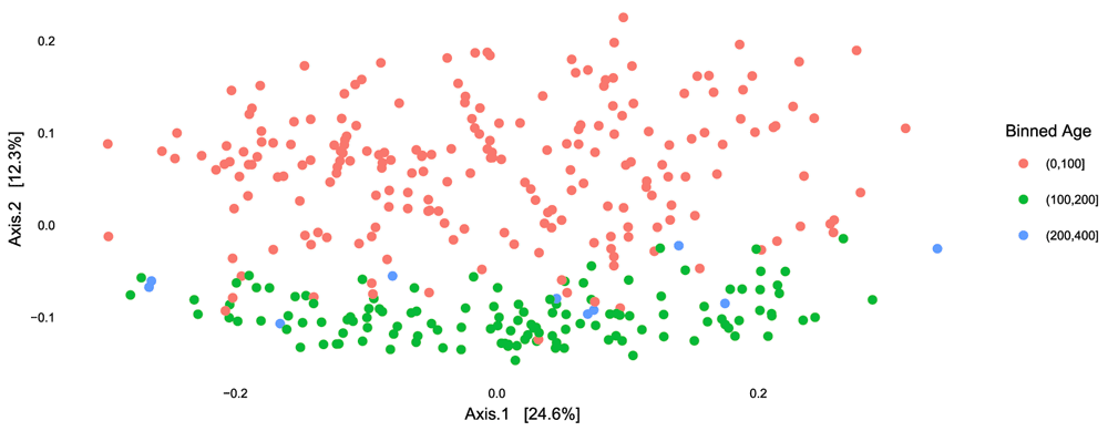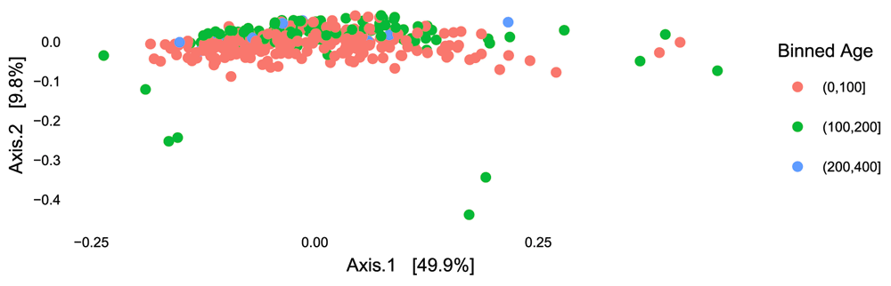 Finally, we can look at the results of PCoA with weighted Unifrac. As before, we find that the second axis is associated with an age effect, which is fairly similar to DPCoA. This is not surprising, because both are phylogenetic ordination methods taking abundance into account. However, when we compare biplots, we see that the DPCoA gave a much cleaner interpretation of the second axis, compared to weighted Unifrac.