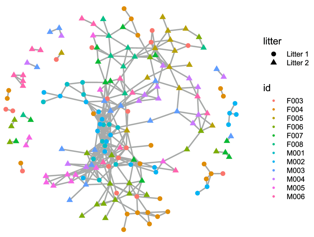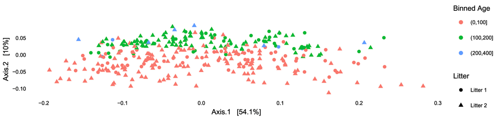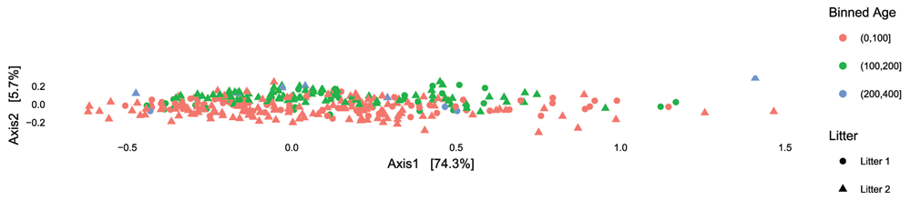 After documenting the outliers, we are going to compute ordinations with these outliers removed and more carefully study the output. We see that there is a fairly substantial age effect that is consistent between all the mice, male and female, and from different litters. We’ll first perform a PCoA using Bray-Curtis dissimilarity.