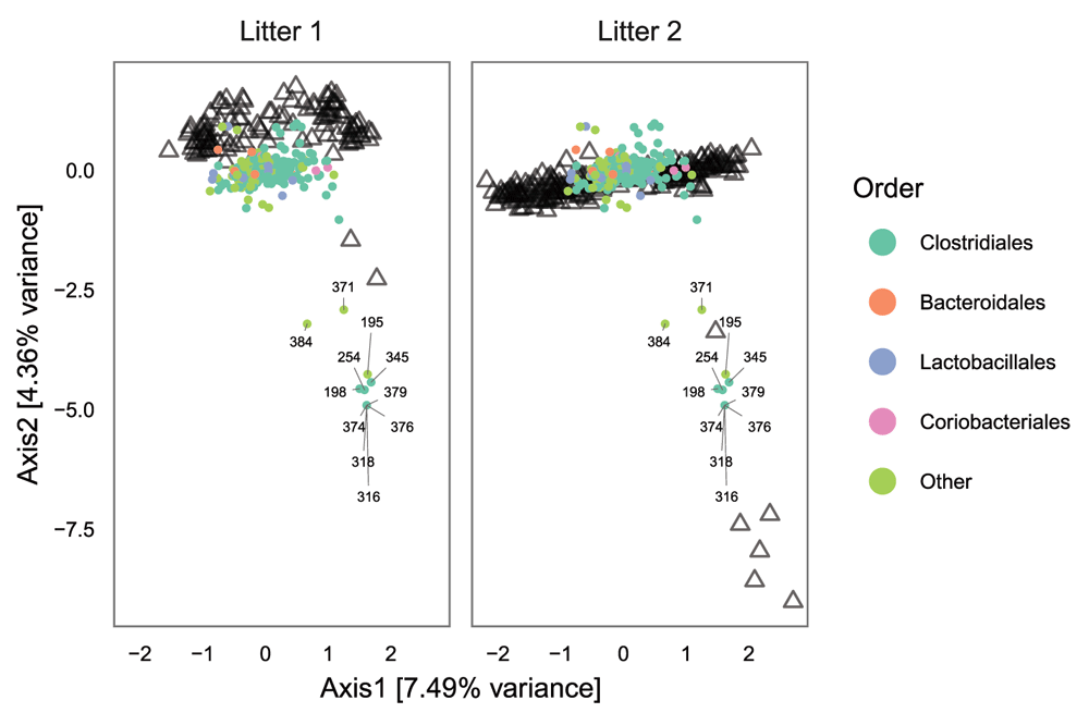 Next we look at double principal coordinates analysis (DPCoA)16,17, which is a phylogenetic ordination method and which gives a biplot representation of both samples and taxonomic categories. We see again that the second axis corresponds to young vs. old mice, and the biplot suggests an interpretation of the second axis: samples that have larger scores on the second axis have more taxa from Bacteroidetes and one subset of Firmicutes.