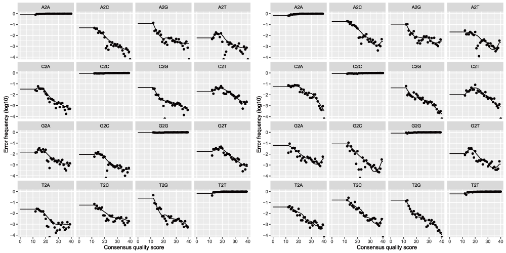 In order to verify that the error rates have been reasonably well-estimated, we inspect the fit between the observed error rates (black points) and the fitted error rates (black lines).