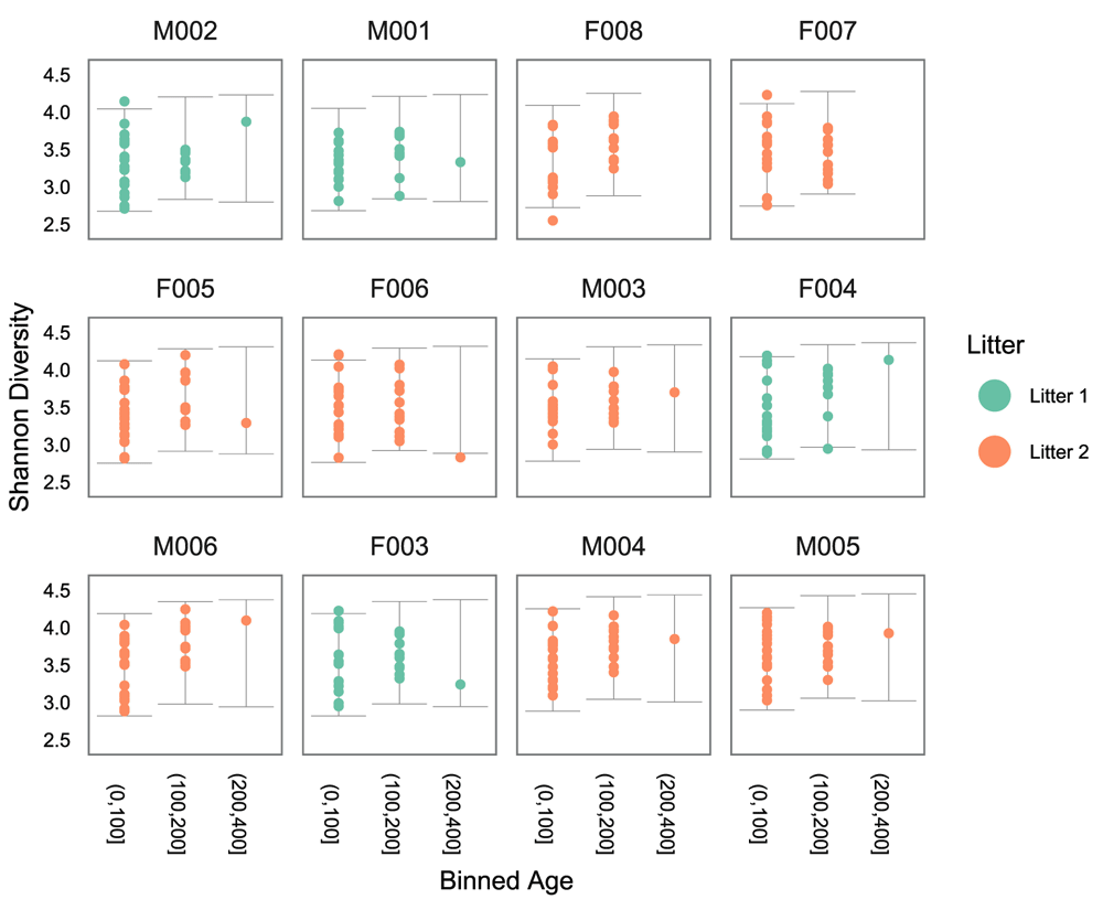 Before we continue, we should check the two female outliers – they have been taken over by the same RSV, which has a relative abundance of over 90% in each of them. This is the only time in the entire data set that this RSV has such a high relative abundance – the rest of the time it is below 20%. In particular, its diversity is by far the lowest of all the samples.