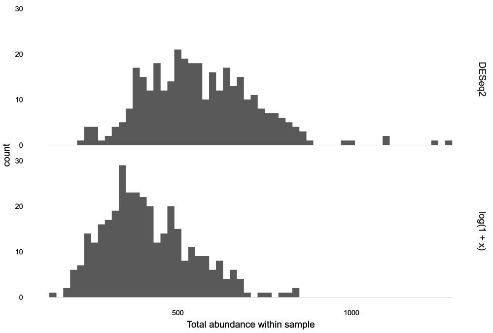 ## Number of tip discoveries: 77abund_sums <- rbind(data.frame(sum = colSums(abund), sample = colnames(abund), type = "DESeq2"), data.frame(sum = rowSums(otu_table(pslog)), sample = rownames(otu_table(pslog)), type = "log(1 + x)")) ggplot(abund_sums) + geom_histogram(aes(x = sum), binwidth = 20) + facet_grid(type ~ .) + xlab("Total abundance within sample")