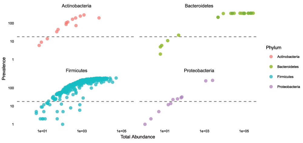 ggplot(prevdf1, aes(TotalAbundance, Prevalence, color = Phylum)) + geom_hline(yintercept = prevalenceThreshold, alpha = 0.5, linetype = 2) + geom_point(size = 2, alpha = 0.7) + scale_y_log10() + scale_x_log10() + xlab("Total Abundance") + facet_wrap(~Phylum)