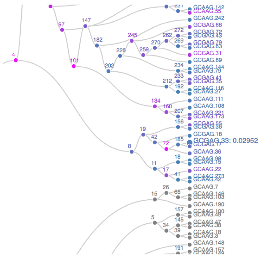 The plot opens in a new browser – a static screenshot of a subtree is displayed in Figure 30. Nodes are shaded according to p-values, from blue to orange, representing the strongest to weakest associations. Grey nodes were never tested, to focus power on more promising subtrees. Scanning the full tree, it becomes clear that the association between age group and microbe abundance is present in only a few isolated taxonomic groups, but that it is quite strong in those groups. To give context to these results, we can retrieve the taxonomic identity of the rejected hypotheses.