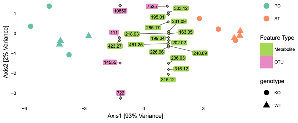# annotation genotype <- substr(rownames(pca_res$li), 1, 2) sample_type <- substr(rownames(pca_res$l1), 3, 4) feature_type <- grepl("\\.", colnames(combined)) feature_type <- ifelse(feature_type, "Metabolite", "OTU") sample_info <- data.frame(pca_res$li, genotype, sample_type) feature_info <- data.frame(pca_res$c1, feature = substr(colnames(combined), 1, 6))
