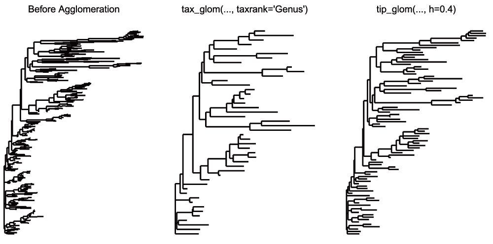 multiPlotTitleTextSize = 8 p2tree = plot_tree(ps2, method = "treeonly", ladderize = "left", title = "Before Agglomeration") + theme(plot.title = element_text(size = multiPlotTitleTextSize)) p3tree = plot_tree(ps3, method = "treeonly", ladderize = "left", title = paste0("tax_glom(..., taxrank='", taxGlomRank, "')")) + theme(plot.title = element_text(size = multiPlotTitleTextSize)) p4tree = plot_tree(ps4, method = "treeonly", ladderize = "left", title = paste0("tip_glom(..., h=", h1, ")")) + theme(plot.title = element_text(size = multiPlotTitleTextSize))