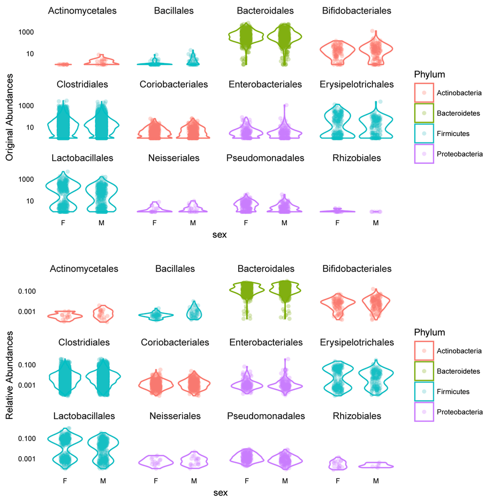 plot_abundance = function(physeq, ylabn = "", Facet = "Order", Color = "Phylum"){ mphyseq = psmelt(physeq) mphyseq <- subset(mphyseq, Abundance > 0) ggplot(data = mphyseq, mapping = aes_string(x = "sex", y = "Abundance", color = Color, fill = Color)) + geom_violin(fill = NA) + geom_point(size = 1, alpha = 0.3, position = position_jitter(width = 0.3)) + facet_wrap(facets = Facet) + ylab(ylabn) + scale_y_log10() }