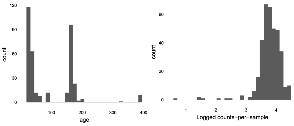 The histogram on the left motivates the creation of a new categorical variable, binning age into one of the three peaks. The histogram on the right suggests that a log (1 + x) transformation is sufficient for normalizing the abundance data.