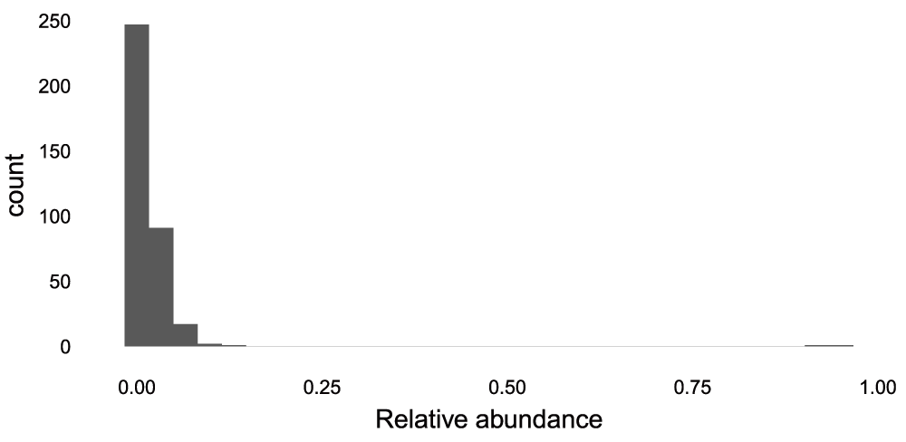 rel_abund <- t(apply(otu_table(ps), 1, function(x) x / sum(x))) qplot(rel_abund[, 12], geom = "histogram") + xlab("Relative abundance")