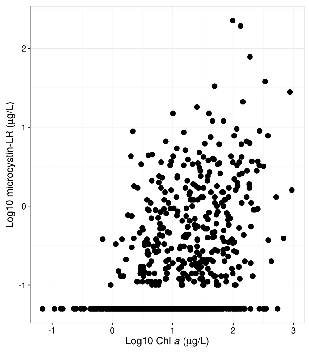 The association between Log10 microcystin-LR and Log10 chlorophyll a shows a wedge pattern (Figure 2). This indicates that, in general, higher concentrations of microcystin-LR almost always co-occur with higher concentrations of chlorophyll a yet the inverse is not true. Higher chlorophyll a is not necessarily predictive of higher microcystin-LR concentrations; however, chlorophyll a may be predictive of the probability of exceeding a certain threshold.