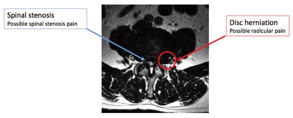 Imaging findings are weakly related to symptoms. In one cross-sectional study of asymptomatic persons aged 60 years or older, 36% had a herniated disc, 21% had spinal stenosis, and more than 90% had a degenerated or bulging disc20.