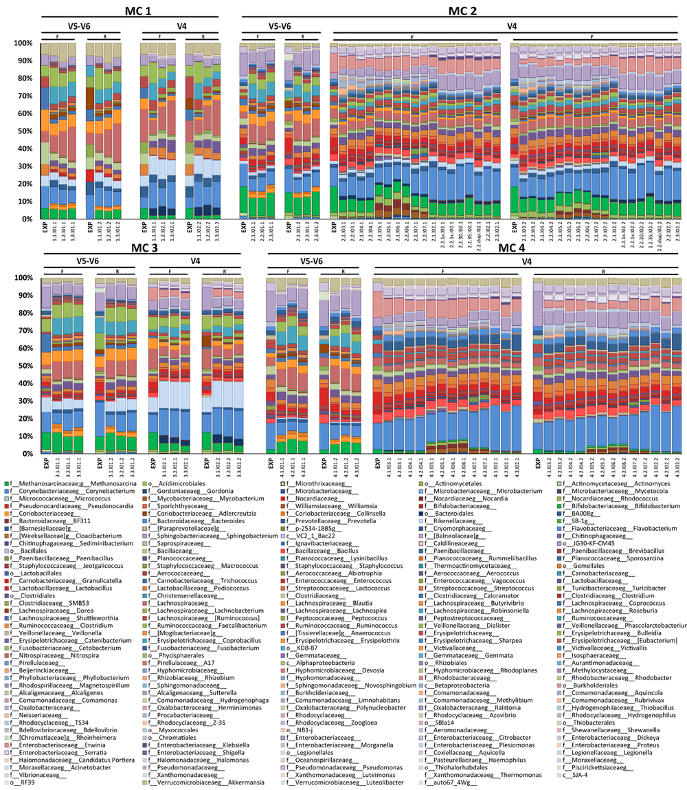 Classified reads are defined as reads mapped to a sequence for which a genus, family or order level classification is given, without considering accuracy. The percentage represents the average over all samples. Spurious taxa are taxonomic classes not included in the MCs. The percentage of spurious reads is the percentage of total reads in the misclassified classes. F: forward read, R: reverse read.