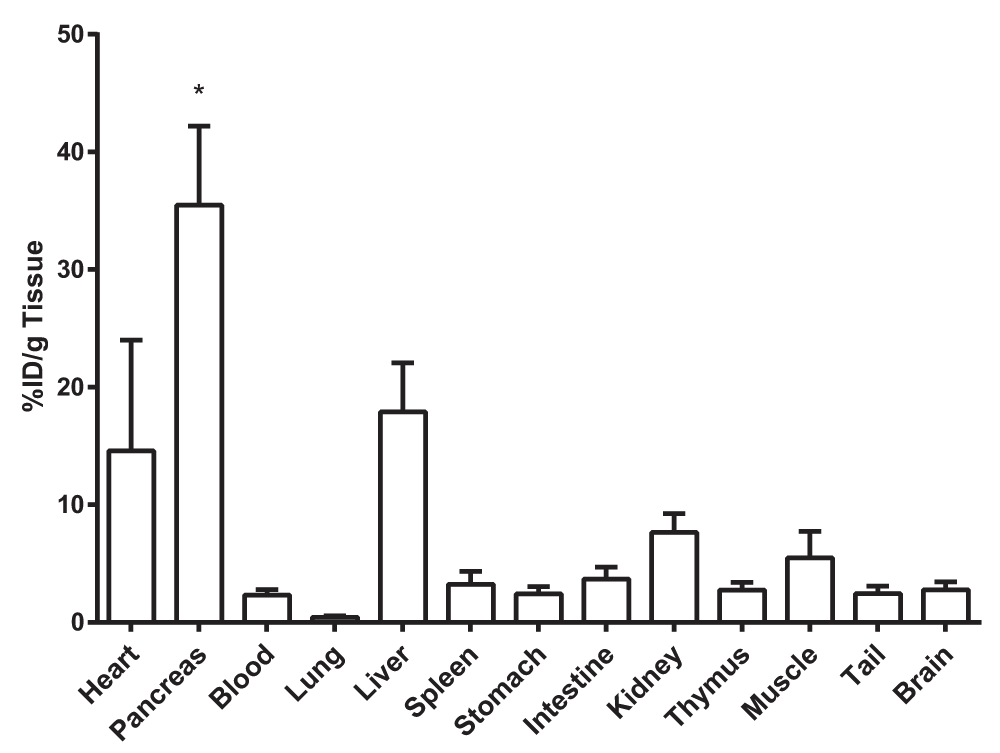 Ex vivo biodistribution was calculated for the indicated organs as % injected dose/g tissue (%ID/g tissue) at 1.5 h after injection. Values are given as mean ± SEM (n=6). * p< 0.05 compared to all other organs except blood, heart, and liver.