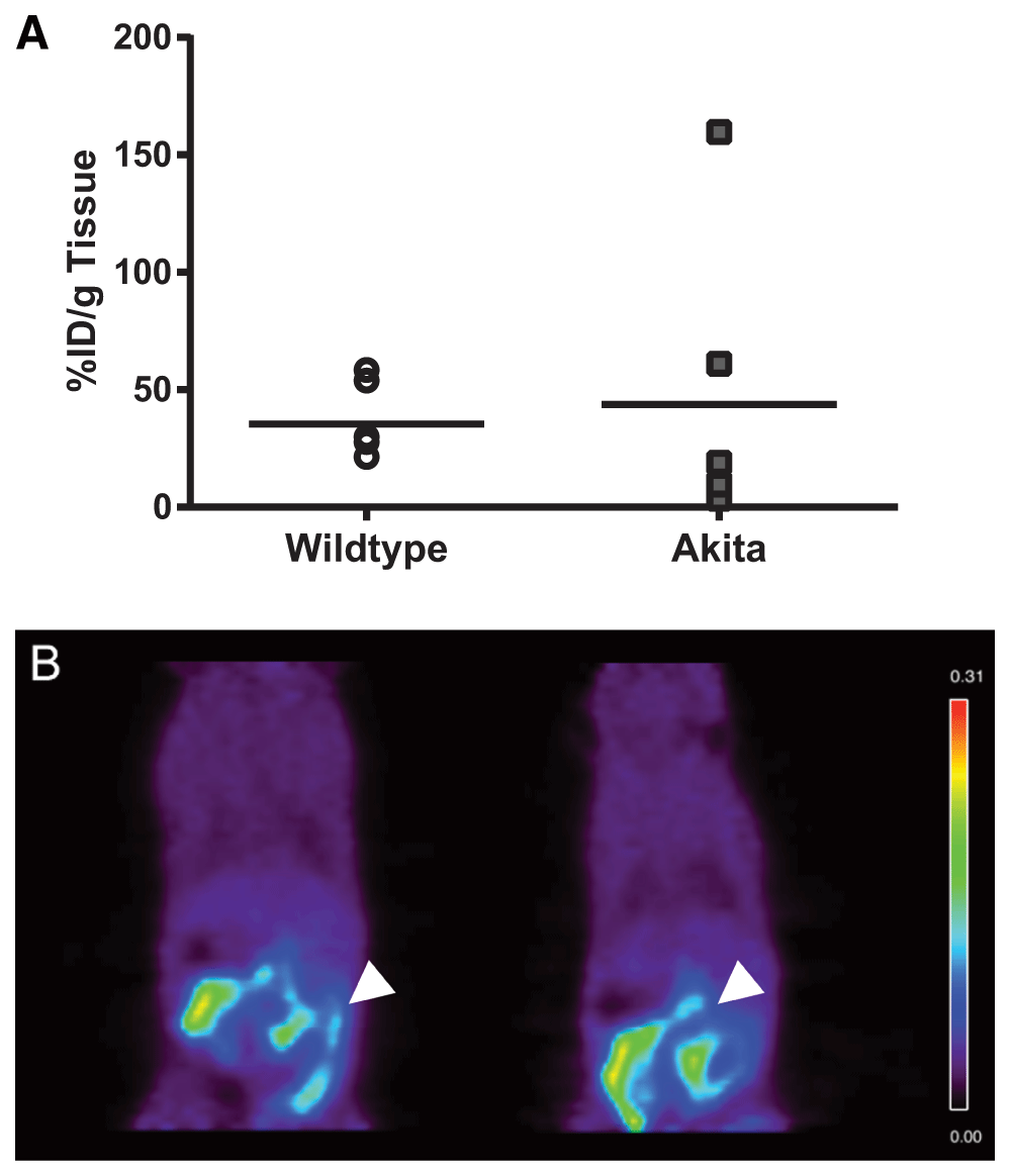 a) Ex vivo tracer uptake was calculated for the pancreas of wt and Akita mice as % ID/g tissue at 1.5 h after injection. b) PET imaging of the pancreas after injection of 18F-L-FEHTP. One hour after injection, static images were acquired for 30 min. Representative images of wt (n=6) and Akita (n=5) mice show highly specific uptake in the pancreas with little detectable background uptake. Arrowheads indicate position of the pancreas.