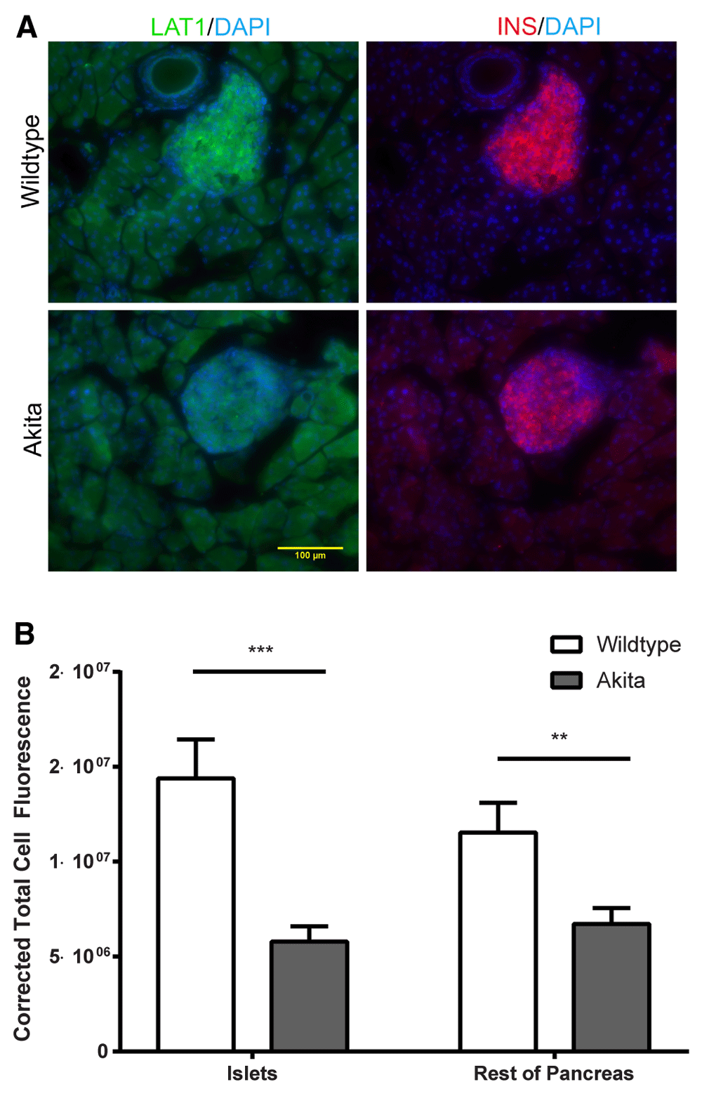 To investigate possible changes in LAT1 protein in pancreatic beta cells, immunofluorescence microscopy for LAT1 was conducted on pancreas sections from mice that had been imaged. Figure 3A shows representative immunofluorescence images for LAT1 and insulin in wt and Akita mice. Image analysis showed that there was significantly less LAT1 immunofluorescence in pancreatic islets from Akita mice, as well as in non-islet, non-ductal tissue (Figure 3B). Additionally, there were no differences in total cell fluorescence between islets and the rest of the pancreas in both wt and Akita mice. This indicates that, at the protein level, LAT1 expression decreased in both islets and the rest of the pancreas in 6-week-old male Akita mice. Insulin immunofluorescence decreased by 62 ± 3% (p =0.0009) in Akita mice; however, total islet area did not differ between the two groups (12204 ± 1246 μm2 vs. 11447 ± 671 μm2, n = 6, p = 0.3).