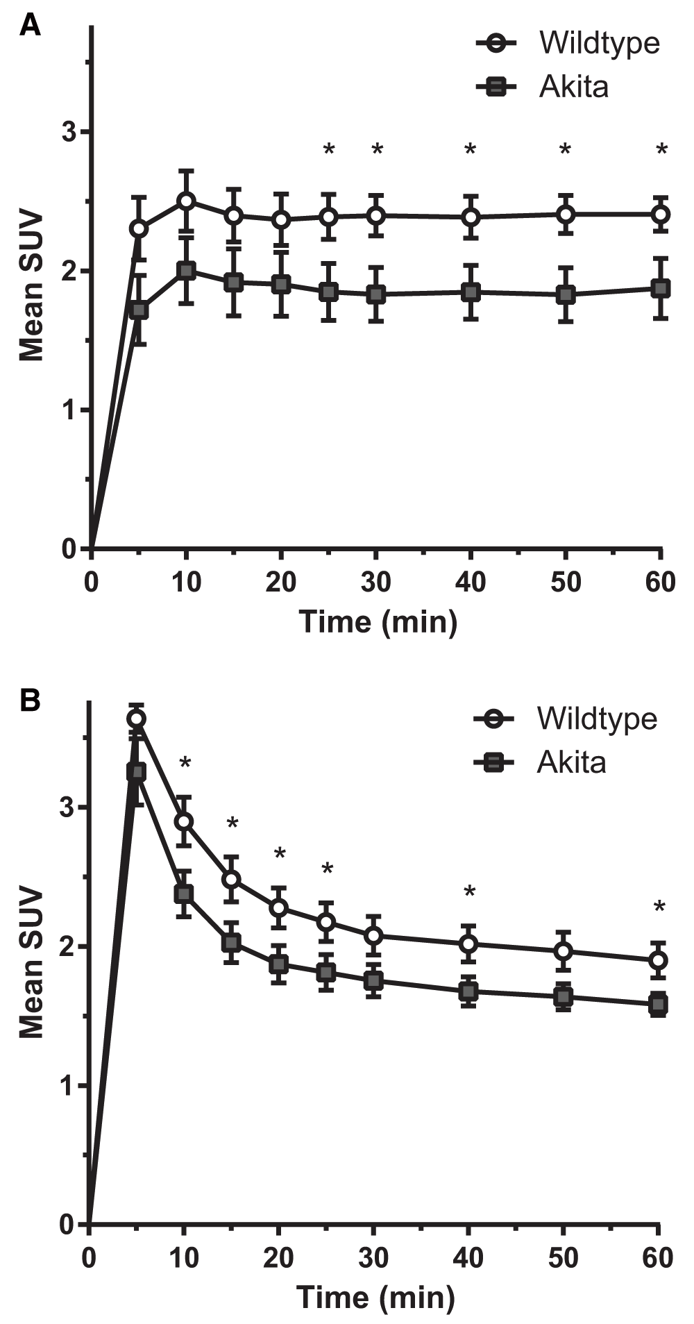 Time-activity curves (TACs) for 18F-L-FEHTP uptake in the pancreas of a) wt and b) Akita mice. TACs are expressed as SUVs from regions corresponding to regions of interest from six image slices corresponding to the areas of the kidneys and pancreas. Values are means ± SEM (n=6 for wt, n=5 for Akita). * p<0.05 compared to wt.